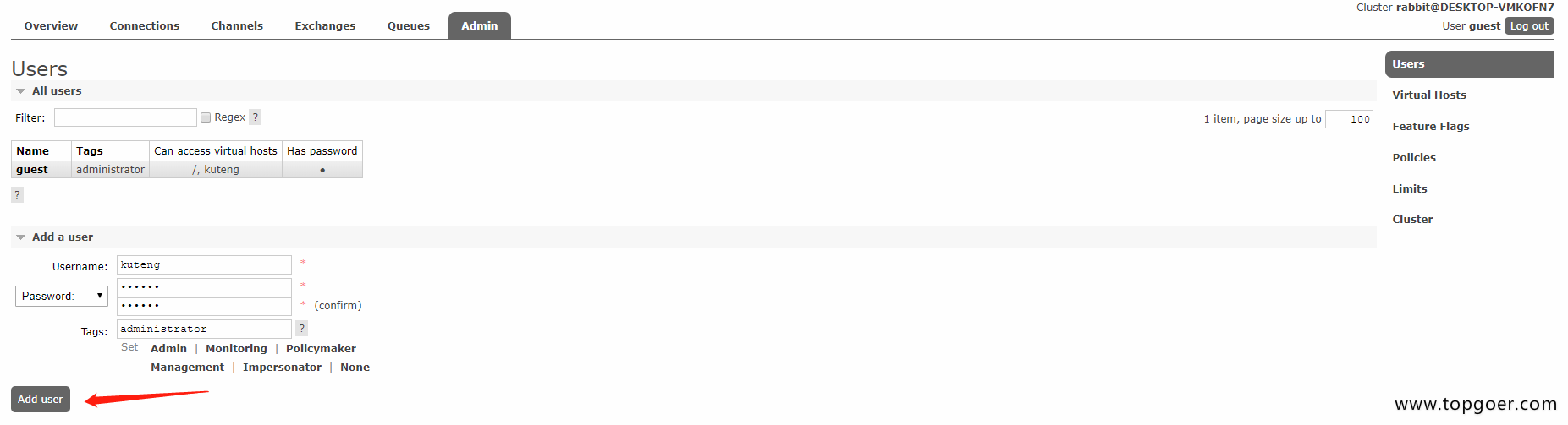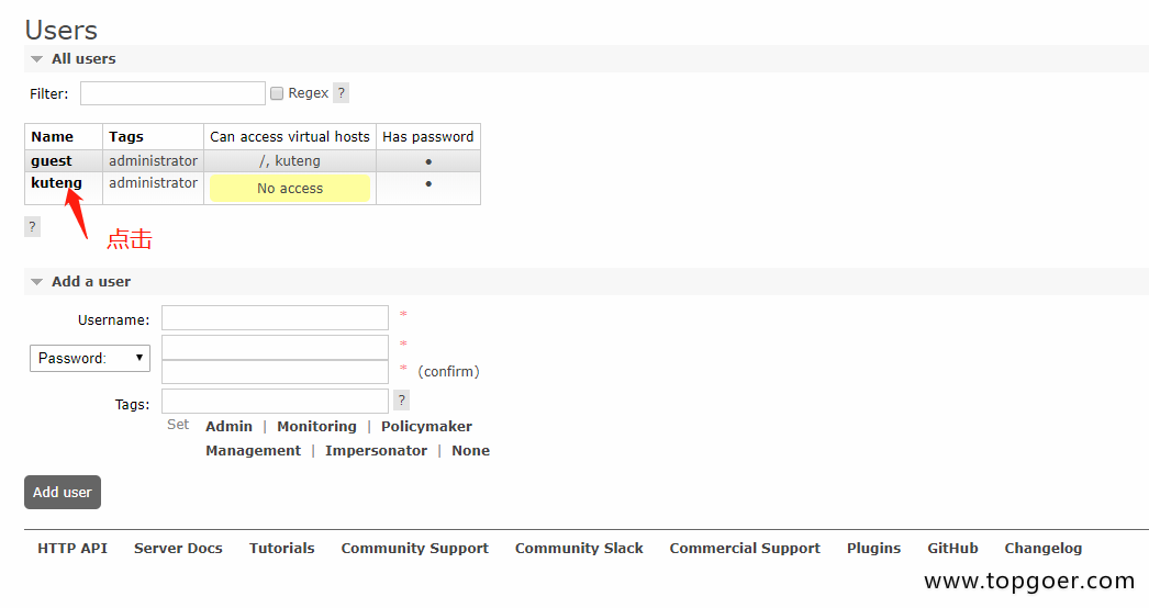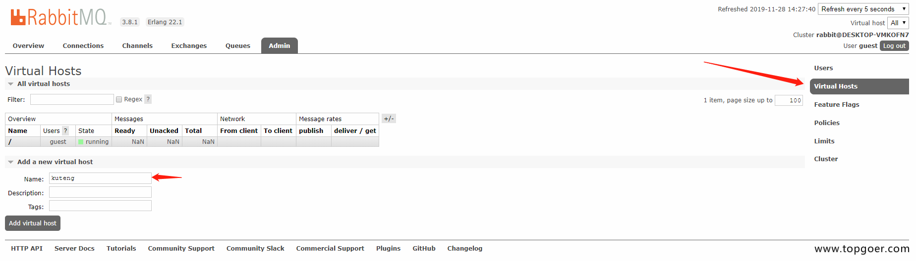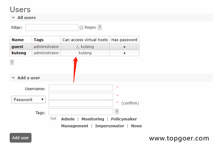 做simple简单模式之前首先我们新建一个Virtual Host并且给他分配一个用户名,用来隔离数据,根据自己需要自行创建
