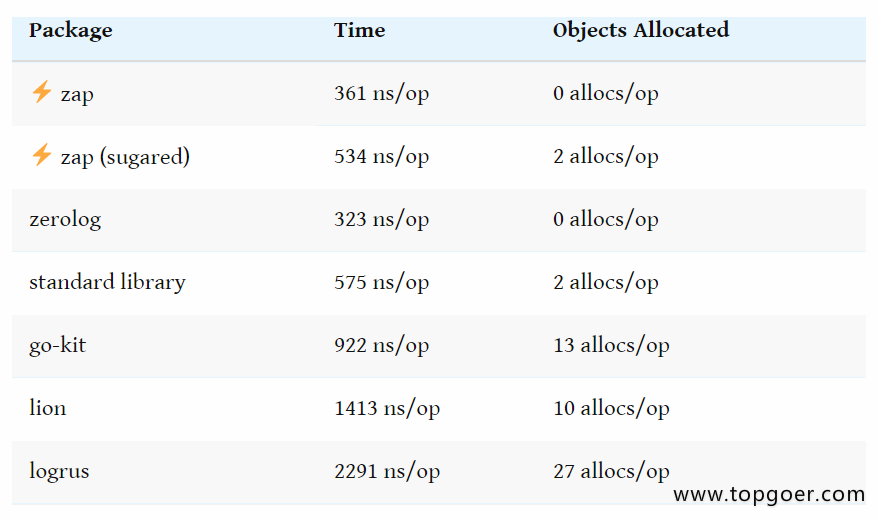 根据Uber-go Zap的文档,它的性能比类似的结构化日志包更好——也比标准库更快。 以下是Zap发布的基准测试信息
